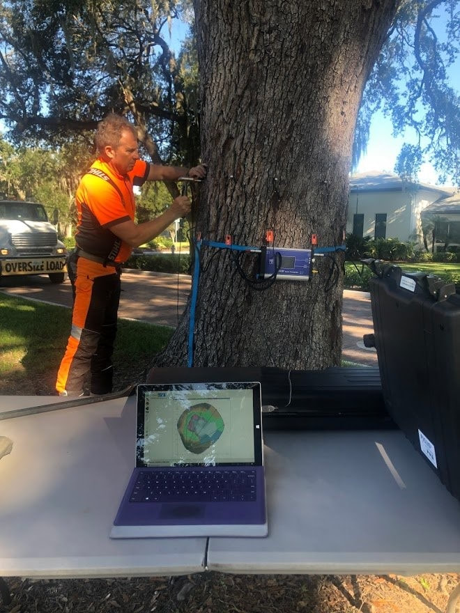 We have two methods by which each of these vital components of the tree’s health can be measured. Physiological health is measured by assessing the tree’s effectiveness in using red light during the photosynthetic process and is called chlorophyll fluorescence testing. The structural stability of the tree is measured by performing a scan through the relevant cross-section using soundwave technology known as sonic tomography.